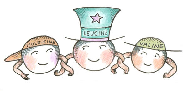 Leucine is a rate-limiting amino acid: protein synthesis is limited to the amount of leucine present. Leucine turns on protein synthesis, something to keep in mind when choosing your protein foods. In addition, leucine must be balanced with valine and isoleucine in order to function properly. These are known as branch-chain amino acids (BCAAs) because of the atomic structure of their branched side chains.