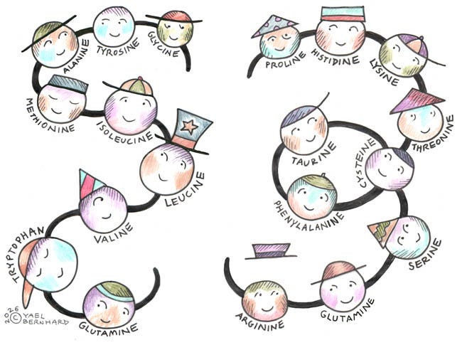 All amino acids are composed of a core structure consisting of two atomic groups: a nitrogen-based amino group and a carbon-based carboxyl group. In between is where the difference lies: the “side chain” attached to this core determines the characteristics of each amino acid. Each has a role to play – or several, for proteins are pleomorphic, with the ability to change form and function. These little fellows wear many different hats!