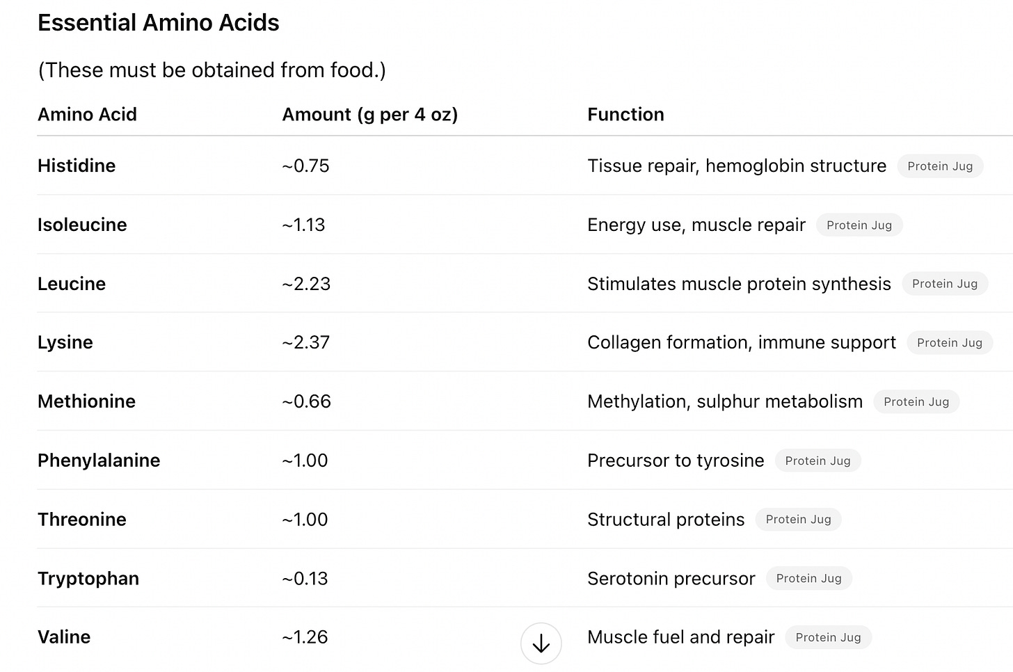 Note: Cysteine is measured separately and would come to .3-.4g in this context. It is more abundant in the joints, hides, and bones of animals than in muscle meat.