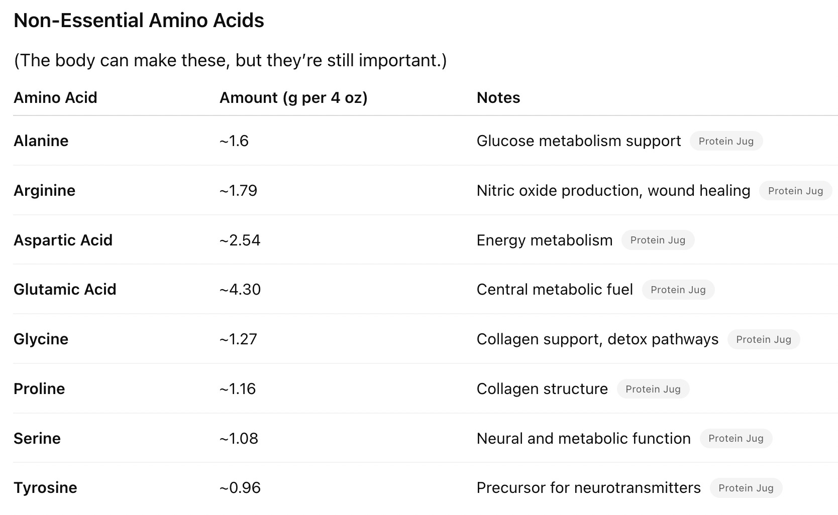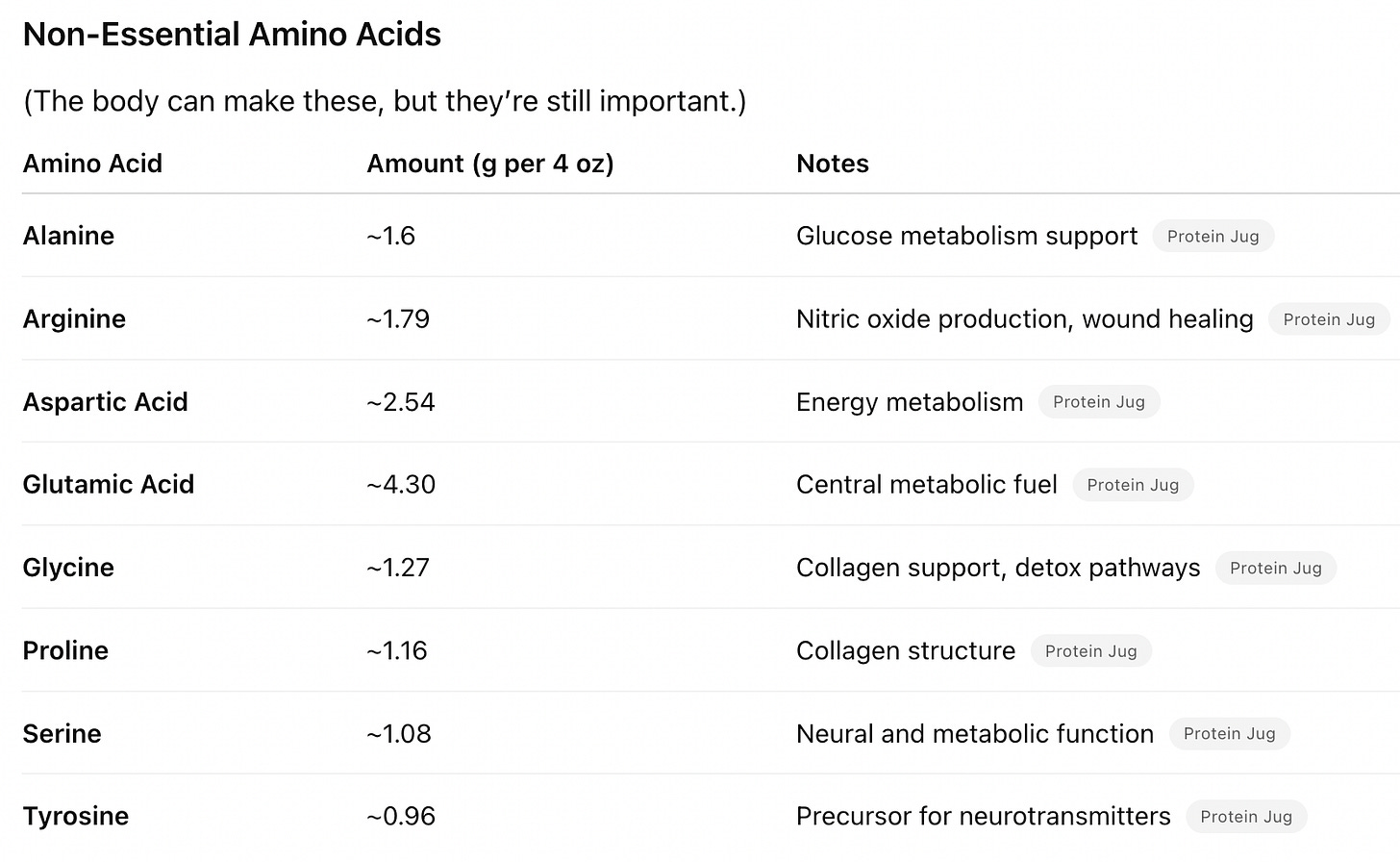 Taurine is also not included here because it is a “conditional” amino acid that is different in its structure. Taurine is necessary for many vital bodily functions, such as cell stabilization, nerve impulses, and antioxidant activity. It's found naturally in meat, fish, and dairy, and is synthesized in the body. A 4oz serving of grassfed beef would contain .4-.6g of Taurine.
